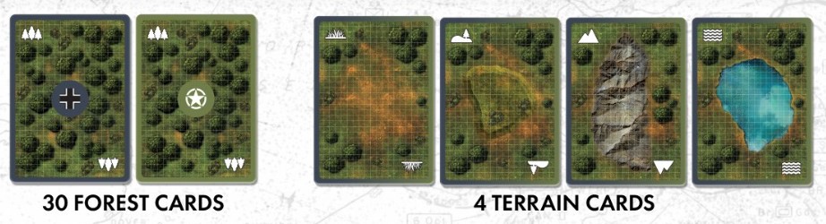 Juan: The Terrain Cards are distributed forming a grid whose size and proportion depend on the chosen scenario. They represent forest or bocage terrain from the European Theater of WWII. The cards allow the hidden displacement of the units that are only revealed when firing or when they are discovered by the enemy.