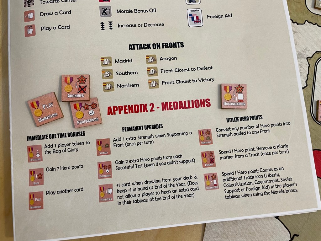 In Action Point 1, we took a look at the Game Board and discussed the Fronts and various Tracks that belong to the different factions. In Action Point 2, we examined the anatomy of the Player Cards and discuss the use of their Action Points and Events as well as the Fascist Event Cards. In Action Point 3, we look into the Morale and Teamwork Bonuses and how they are best used by the players. In this Action Point, we will discuss the uses for Hero Points and take a look at the various Medallions that can be acquired and their uses.