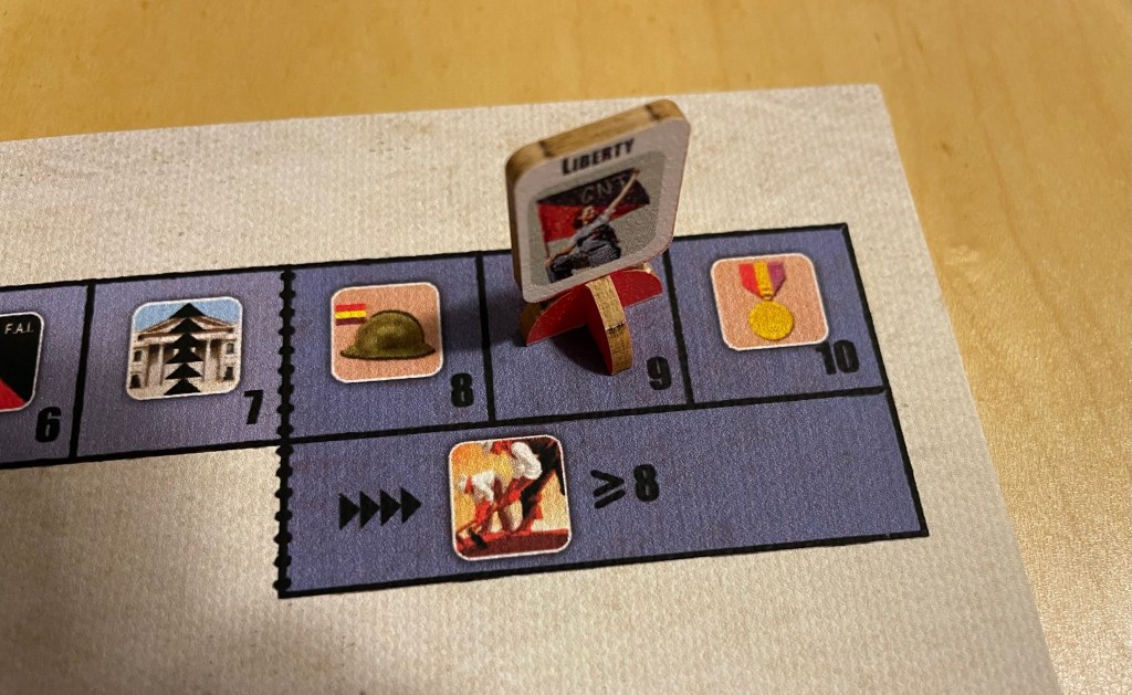 Moving the Liberty or Collectivization Tracks costs 3 Hero Points per step moved. This one costs more because the Anarchists own these Tracks and because they basically start in last place, and have a much more difficult time in gaining Initiative, which remember leads to Glory Points, have to be able to protect these with the added costs. And let me tell you, the difference between 2 and 3 Hero Points is HUGE! You will not see players spending 3 Hero Points on a single option very often.