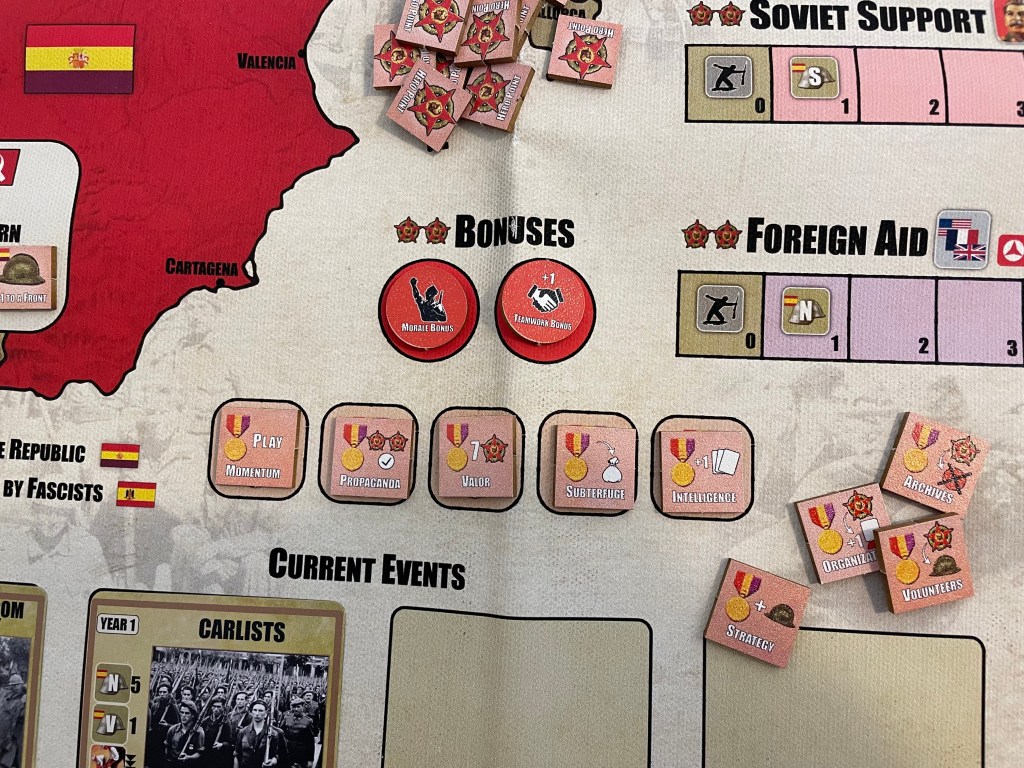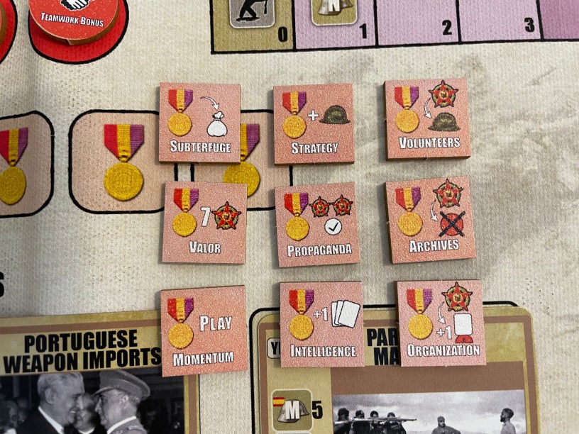 Turning on a Bonus will cost 2 Hero Points. Remember, that having the Teamwork and the Morale Bonus on is very important to the shared experience and mutual aid given by players to the fighting the Fascists and keeping the Fronts under control. Remember that the Teamwork Bonus is used by the player when they are placing Republican Strength Markers onto Fronts to remove additional Fascist Attack Markers (Teamwork Bonus) or to get additional activations of their Symbols found on cards that have been played to the player’s Tableau (Morale Bonus). Keeping these Bonuses on is very important for the players and they will find their mission that much easier when they do have them.