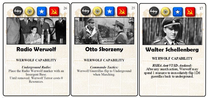 –Radio Werwolf: possibly the strongest Capability in the game, this Event lets you place the Radio Werwolf Token with a Base, and as long as it survives your Terror Actions are free! Werwolf is usually strapped for cash and relies on Terror to gain points, so this is a must-have.