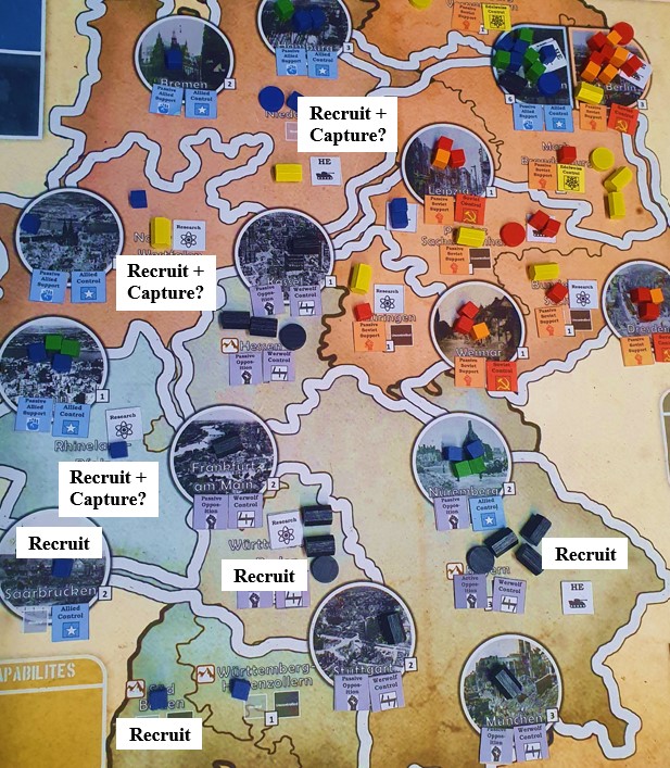 –Recruit + Capture: This is my preferred opening. Werwolf starts with 10 resources, enough to Recruit in plenty of spaces. Start with Niedersachsen, Nordrhein-Westfalen, Rhineland-Pfalz, Sud-Baden and Saarbrucken. Why these spaces? Because they all have a solid population of 2 and you can grab several Research and HE Tokens on turn one, either by placing new pieces on top of them if unclaimed or using the Capture Special Action to steal them from whoever went first. It is also worth Recruiting in Bayern and Baden-Württemberg too (and you are placing 2 guerrillas each due to the Bases here) for the same reason. You may have spent a large chunk of resources on turn one with this opening, but you now have guerrillas throughout the countryside ready to do Terror Actions later. Your accompanying Special Action with this opening would usually be Capture to grab Research and HE Tokens, but Assassinate is also an option. The best target for this is Allied Troops – as every casualty hurts Allied Morale and you are weakening the opponent who is most directly competing with you for the hearts and minds of Germany. Well-timed Assassination Actions can also give you control of some provinces early in the game – very useful when it comes to Crisis Rounds.