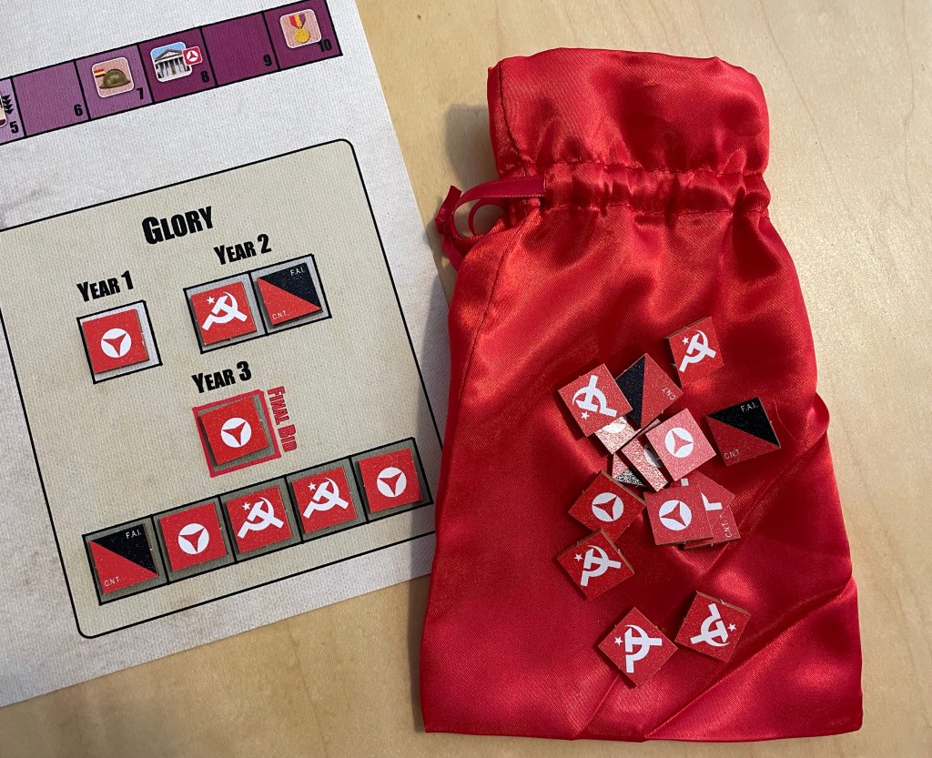 Victory will only be achieved if the 4 Fronts have at least a value of +1 or better at the end of Year 3. This is important to remember, and I have found that players will be making a big commitment of their actions to ensuring that the Fronts are positive during Year 3. If and only if the war is won at the end of Year 3, we will then move to the Bag of Glory that players have been building throughout the entire game by adding their tokens. Player tokens are then drawn from the Bag of Glory until the Glory area and its remaining 5 spaces are full. At the end of the drawing, the player who has the most Glory will be named the individual winner of the game and their ideology will be first and foremost in building the new future of Spain.