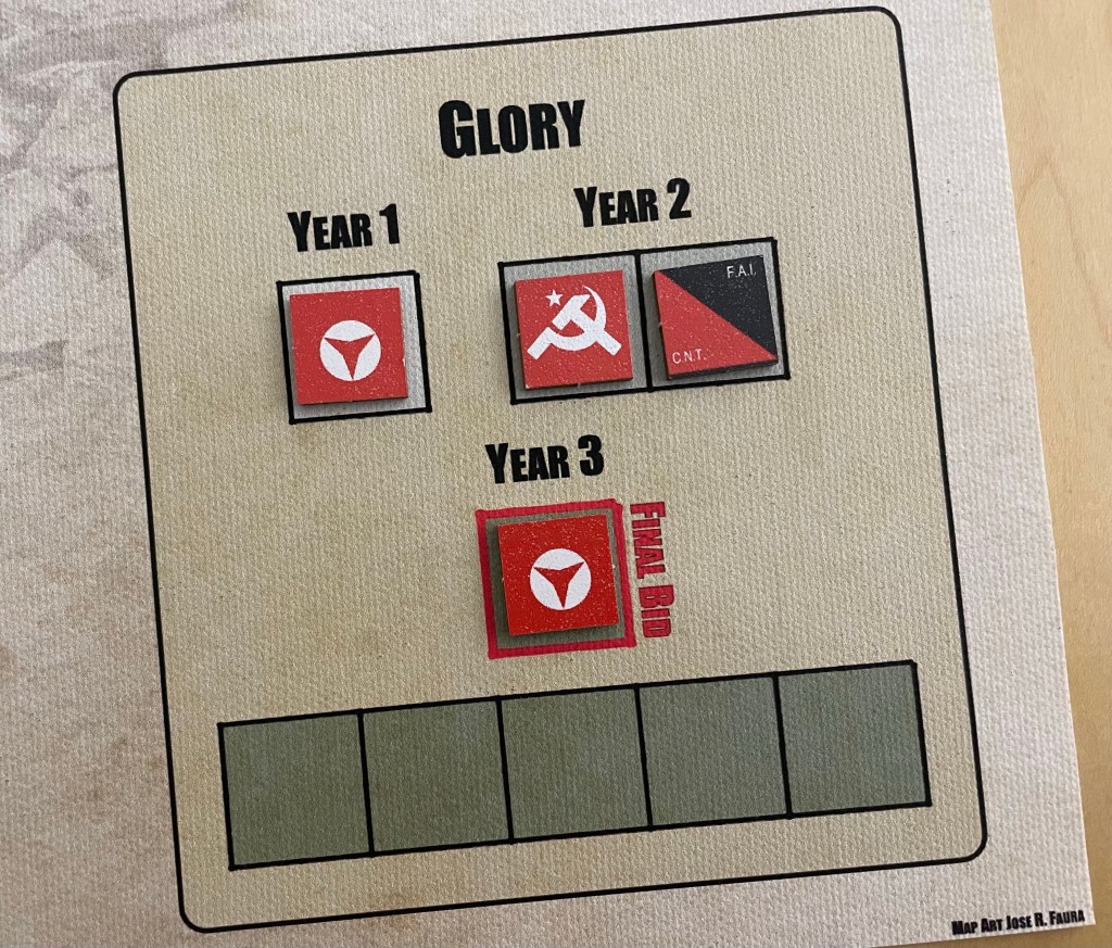 The Final Bid portion of the game is a bit different as well. After the Fascist Event is revealed at the beginning of Year 3, each of the players have to simultaneously choose up to 3 cards from their hand as their Final Bid. These cards will not be able to be played as they will be used for the Final Bid and then discarded. The player who chose to bid the largest total number of Action Points on these cards wins the Final Bid and score one of their tokens directly to Glory in the Final Bid space on the board.