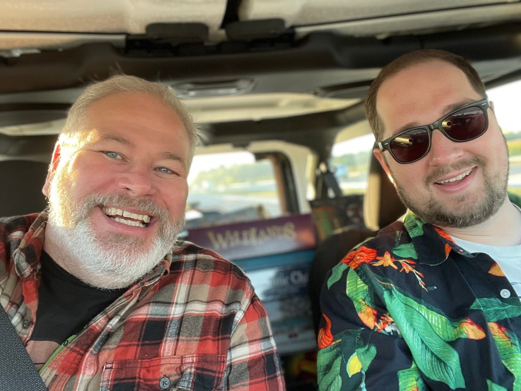 We met at our in-laws house and began the process of transferring my games over to Alexander’s Jeep as he was driving due to his vehicle being considerably larger than my Ford Explorer and being able to hold more games! The car was packed to the gills and we took off around 7:30am for the 5 1/2 hour trip up I-65 through Chicago and then onto the Dan Ryan Expressway over to Wisconsin. As we started out, some of the games shifted and fell into holes in the back but after about 20 minutes it appeared that all had settled. We were both in good spirits as you can see in the picture below and were very excited to get going.