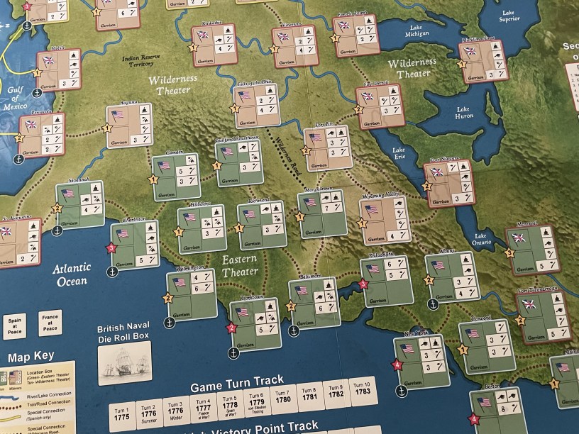 The Game Board is oriented very differently than most American Revolutionary War games that I have played as it is oriented with south on the left and north on the right. The main reason for this orientation is to widen the focus of the board to include not just the original 13 colonies on the eastern seaboard but also to take into account the fighting covered on the western frontier. The game takes into account locations on the frontier such as New Orleans, Kaskaskia, Vincennes and St. Louis.