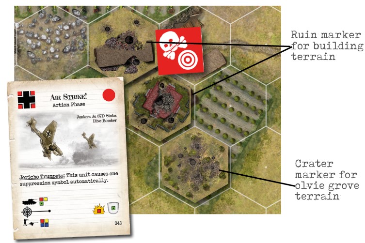 A third type of combat is the Tactical Air and Off-Board Artillery Support. This is integrated through Command Cards and simulates the impact of airstrikes or divisional artillery and ship support from behind the lines.
