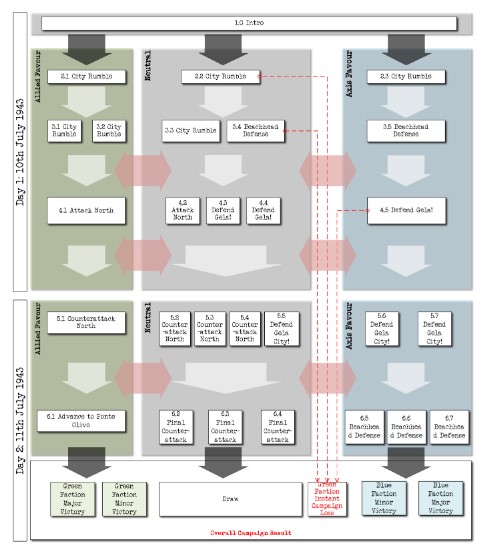 The outcome of a campaign can be historical or it can deviate from it depending on the game play and battle luck. Theoretically, if the game is played optimally, the landing at the Gela Beachhead can driven back into the sea.