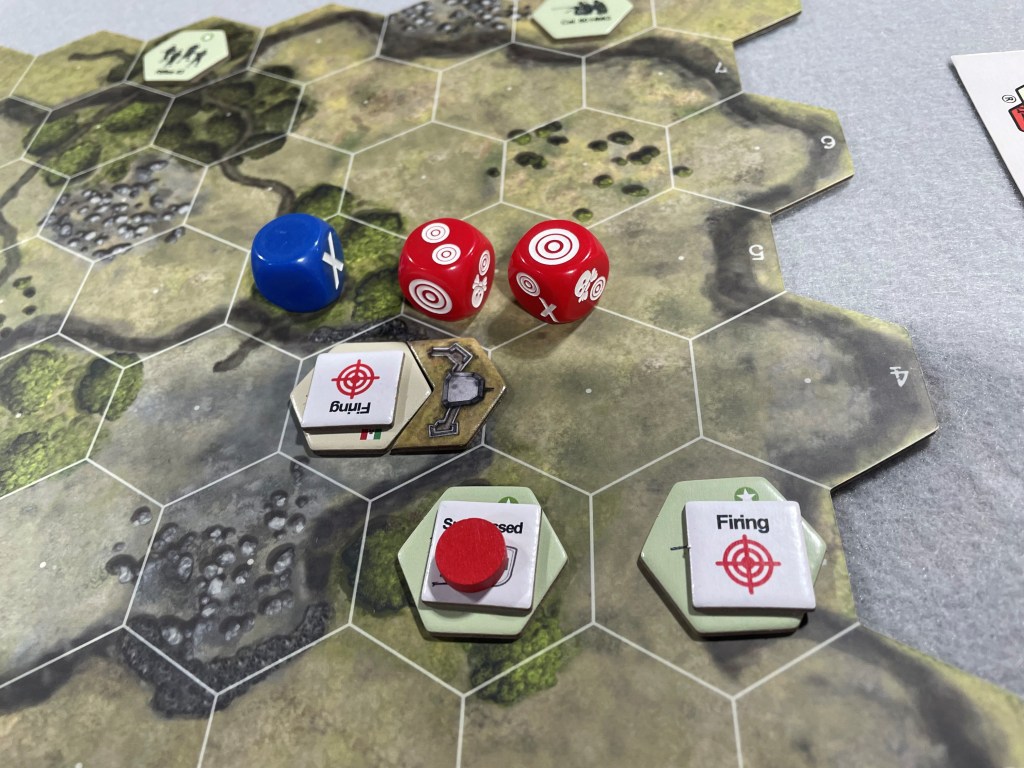 We have also abstracted the behavior of soldiers under stressful conditions. Suffering casualties or coming under fire means there is a chance they will become Suppressed. This means that the combat stress caused by excessive fire, wounding and casualties has become so high that the soldiers throw themselves into the dirt and keep their heads down. This gives them a temporary advantage in defense, but also prevents them from taking any further action. If this suppressed unit is then suppressed again by another result, they start to disengage and perform a retreat. This is how we have tried to include the issue of Troop Morale. We are really pleased with how we have managed to incorporate the luck factor into the game. In real combat, training but also personal luck often determines whether an action is successful, and its consequences. With our dice system, we have a statistical basis for estimating results, but also a dose of luck that makes them a little harder to predict.