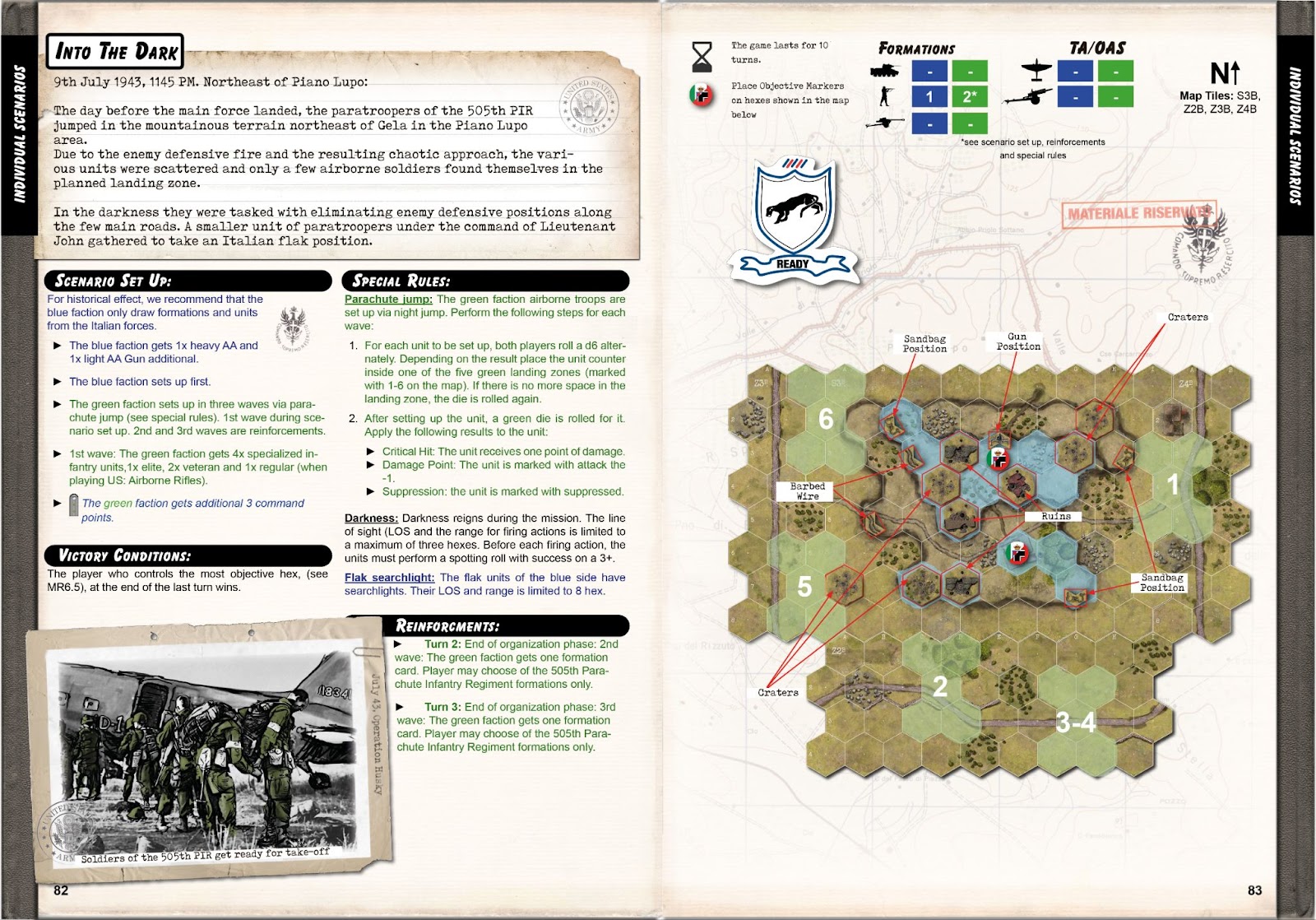 In principle a small tactical situation but very exciting. The US player cannot predict exactly where his Airborne troops will land and whether they will arrive in full strength on the battlefield. The mission, however, is to neutralise and occupy an Italian hilltop position in the rear. Since this action takes place at night, there are special rules such as Darkness to simulate the situation of short LOS and poor visibility. However, since the defenders have flak search lights, causing the Americans to make the best use of the terrain as they approach the objectives.