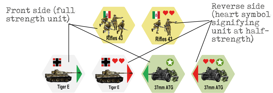 Wolfgang: Every Infantry, artillery and vehicle unit is represented in Assault by a counter. These counters have a front and reverse side. Units at full strength are placed on their front side and are flipped to their reverse side when they have suffered damage points equal to half their original strength. Their full and half-strengths are noted by the use of heart symbols on their unit cards. Here is a look at several different counters.