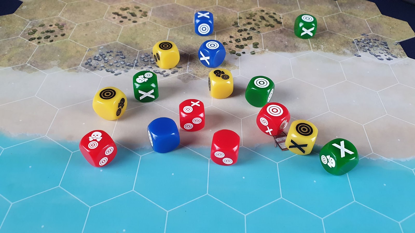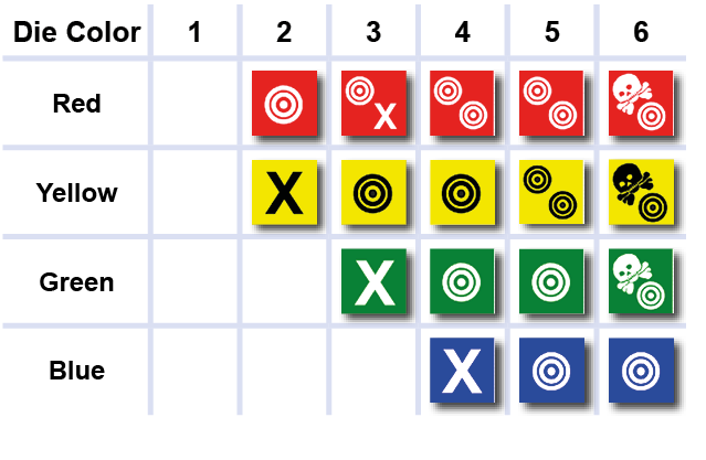Wolfgang: There are four different colored dice with symbols on them. These dice are used for attack and for defense rolls. These dice are also used for special situations such as firing smoke with the mortar or triggering a special effect.