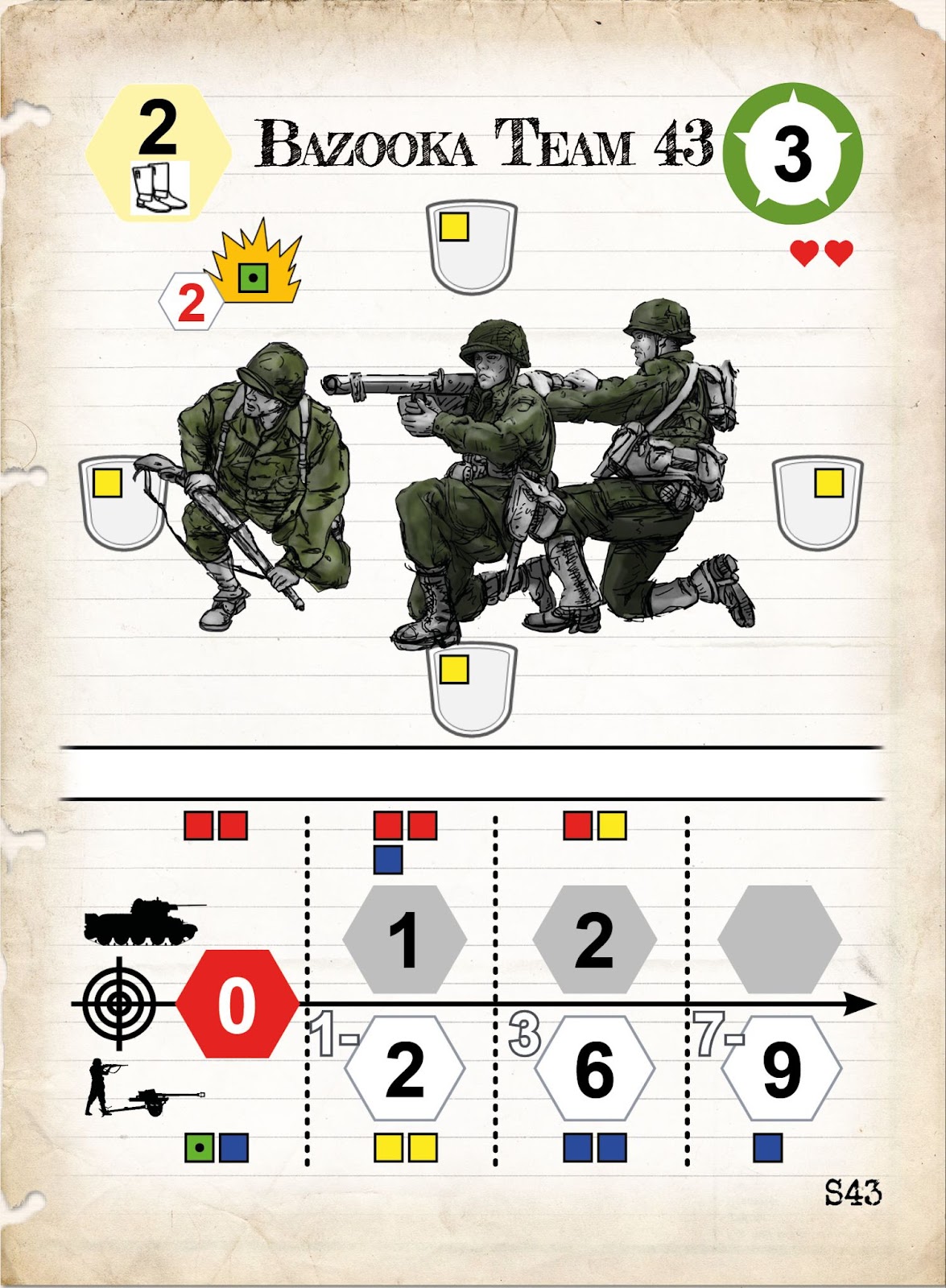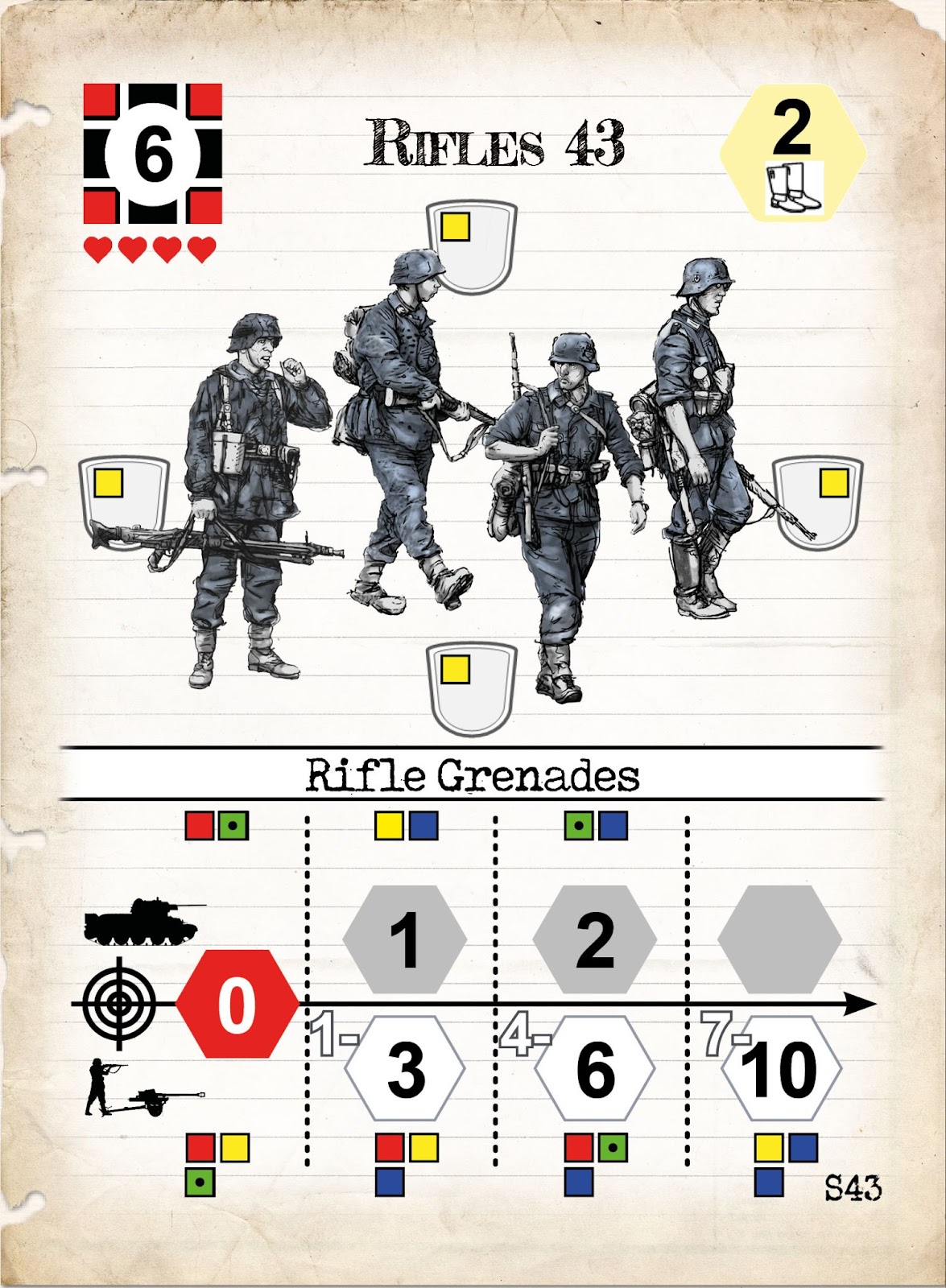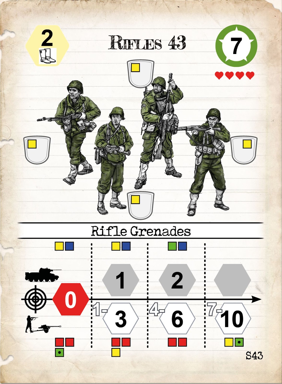 On the US side, there were equipped differently, with fully and semiautomatic weapons e.g. the M1 Garand or M1918A2 BAR. These groups were superior to the German rifle groups at shorter distances. This fact can be seen on the unit cards (compare the dice for infantry targets):
