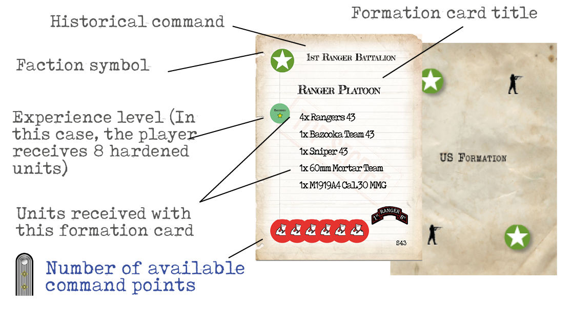 Wolfgang: Each card will state what type of formation it is, (in this example a Ranger Platoon), and list the different units that the player will have, if they draw it. It will also show which historical command the formation belonged to during the war.