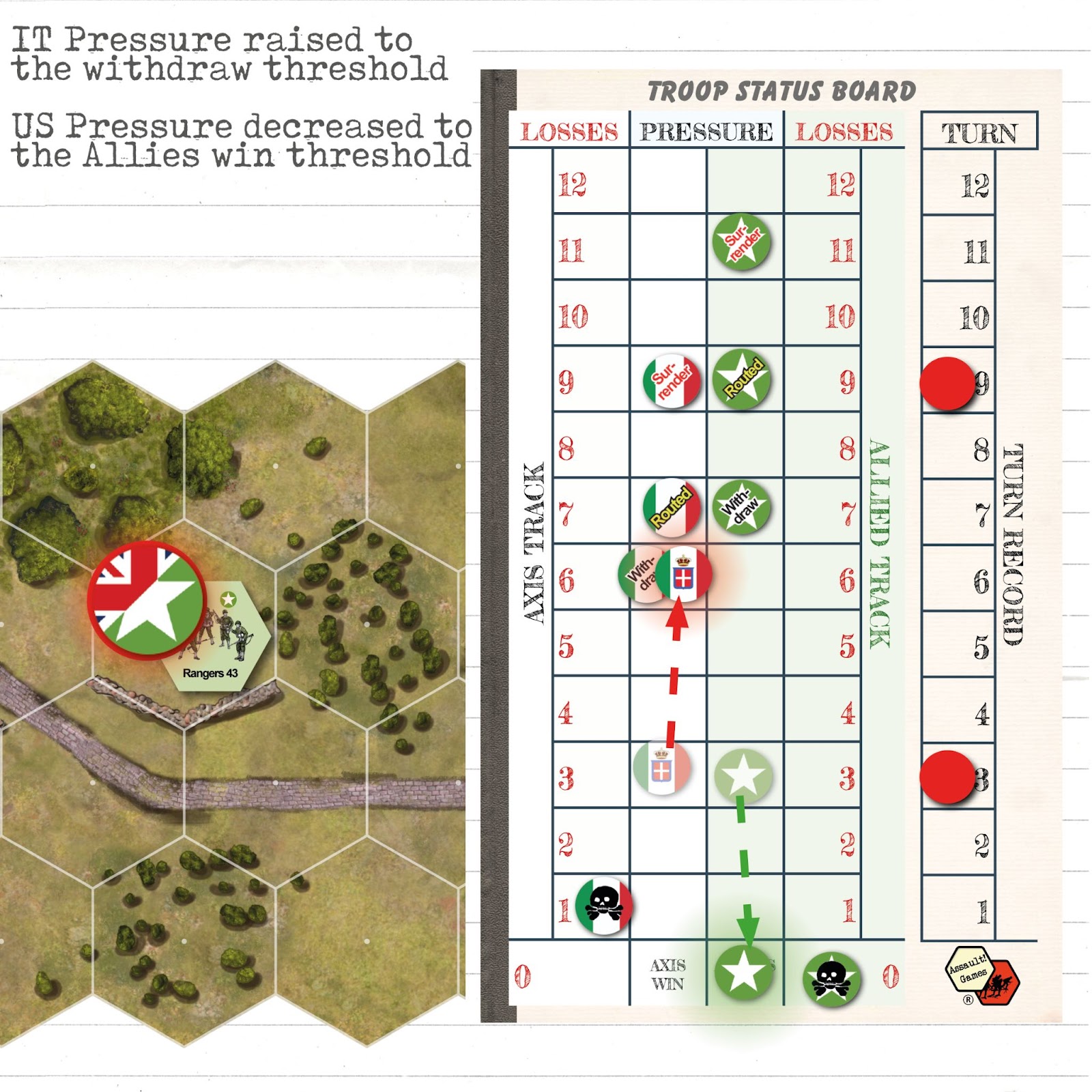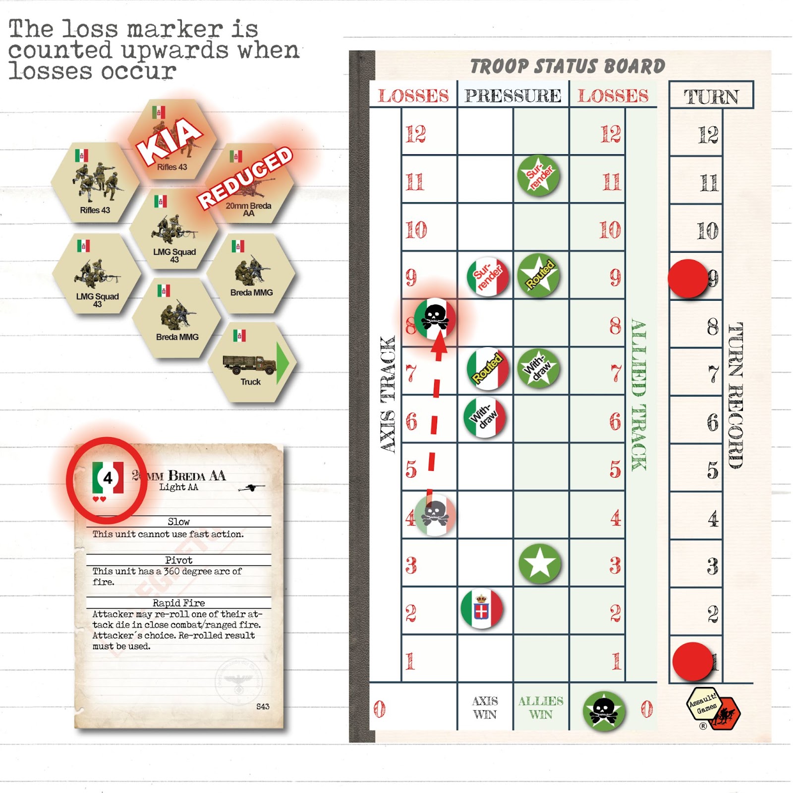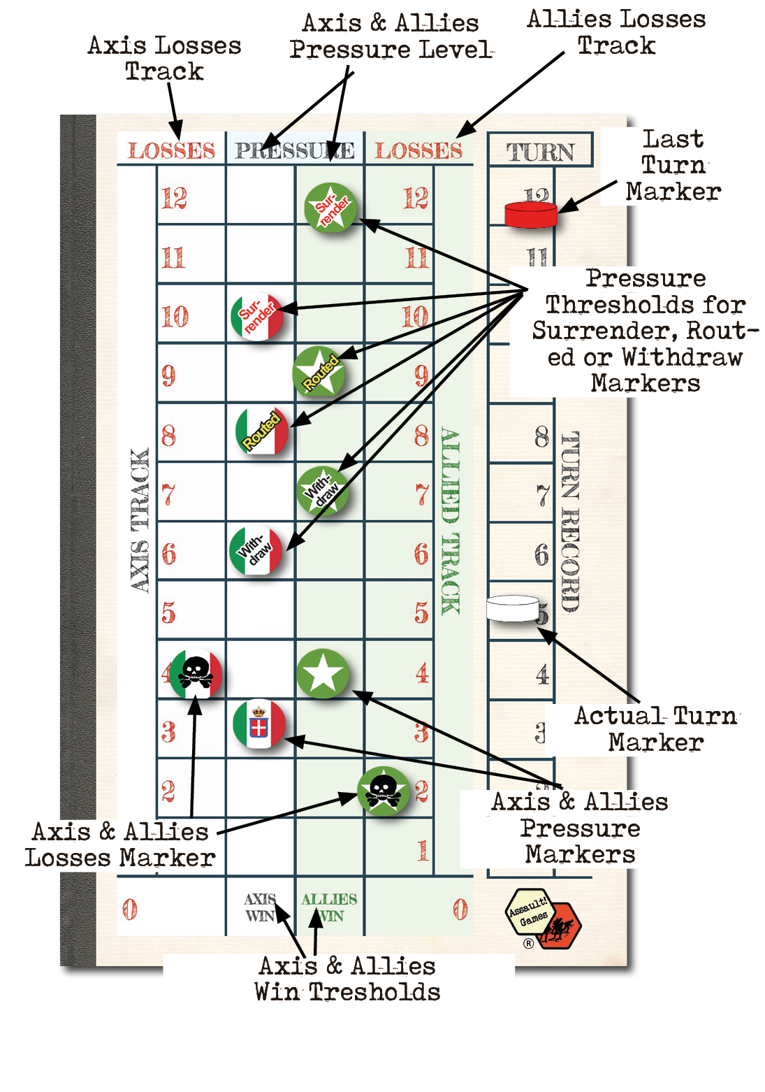 Wolfgang: The Troop Status Board is used to record the effects during combat, such as casualties and pressure. It is important for both players to monitor the current pressure marker.
