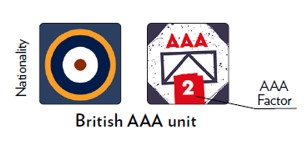 Each Scenario starts with some AAA in different strengths available to the British Player. Furthermore, it is possible to “buy” new AAA units of different strengths and deploy them when ready (it takes two turns to “build” an AAA unit).