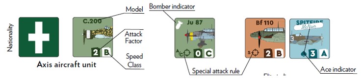 Nicola: Aircraft counters have two sides: the front of the counter has a nice silhouette of the aircraft and the name of the aircraft type, as well as its main combat values and some symbols for special types of attacks. The back displays a national insignia and is used when initially the players transfer their forces on the main map.