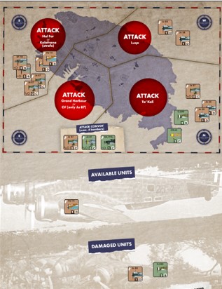 Axis attacks on the Convoy can reduce the number of Logistic Points delivered (down to zero) and, if the Convoy is also carrying replacement aircraft, it can force (once per game only) a damaged aircraft carrier to have to seek shelter in Grand Harbour (this offers the chance to replicate the historical HMS Illustrious situation of early 1941). This represents a possible quicker path to victory for the Axis player, in that sinking the CV counts as having put one of the airfields out of action, with the advantage that the British Player will never be able to repair it!
