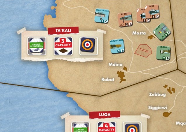 Only in the last scenario, airfields can increase their capacity (and their protection vs. strafing from Axis fighters) by building blast pens on them. This was initiated historically on Luqa and Hal Far with a system of dispersal and revetments that eventually made the two airfields almost connect, but the works were not completed until much later than the timeframe of the game. I nevertheless wanted to give the possibility to the British Player to choose and invest in these improvements earlier on.