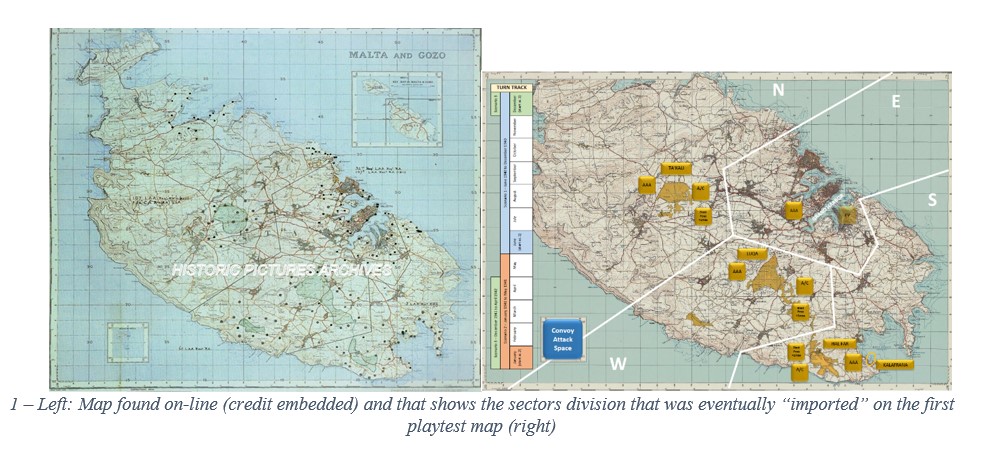Nicola: The entire island of Malta has been divided in 4 sectors, based on a 1943 AAA map I found on-line and that served as the first playtest map. This is the model I chose in order to manage the “airspace” over the island, and as such, each sector also contains part of the surrounding sea area. There is a further abstracted, notional space which is the Convoy Box. This represents the area of the Mediterranean west of Malta that could be reached by the Axis air units based in Sicily.