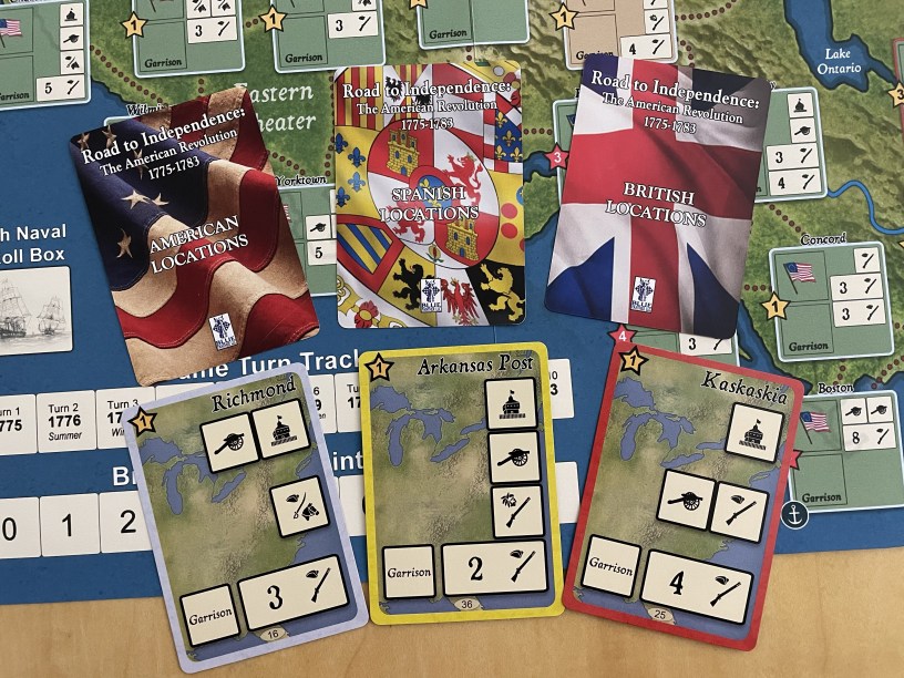 There are 38 Locations shown on the Game Board with 20 Locations being located in the Eastern Theater identified by green colored boxes and 18 Locations located in the Wilderness Theater identified by tan colored boxes. Of these 38 Locations, the British start with control of 15 Locations (Natchez, Prairie du Chien, Mobile, Kaskaskia, Vincennes, Fort St. Joseph, Michilimackinac, Pensacola, St. Augustine, Fort Detroit, Fort Niagara, Montreal, Fort Ticonderoga, Quebec and Nova Scotia) worth of a total of 25 Victory Points. Of the remaining 23 Locations, the Americans control 20 (Albany, Augusta, Baltimore, Boston, Camden, Charleston, Concord, Falls of the Ohio, Fort Pitt, Guilford Courthouse, Hillsboro, Maine, Morgantown, New York, Philadelphia, Richmond, Savannah, Wilmington, Wyoming Valley and Yorktown) worth a total of 36 Victory Points and the Spanish control 3 Locations (New Orleans, Arkansas Post and St. Louis) worth 6 Victory Points.