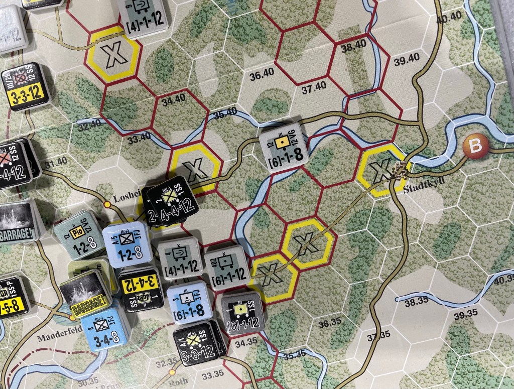 Traffic Hexes are shown on the map with a yellow highlight in the hexes with a large X in the center. These hexes will apply a DG Marker to any German units that start movement in or enter these hexes as they simulate the trouble with driving lots of tanks, trucks and other vehicles on the small one lane roads throughout the Ardennes. You can stack in the Traffic Hex, but only if you move the units as a stack into it. If you send one unit into the hex, no others can enter it. Once you move a stack in there, the hex becomes prohibited for all others afterward which is the intent of the designer to stop other units from entering whether just to go there, or to attempt to scoot past the traffic on the road by using the off-road MP costs.