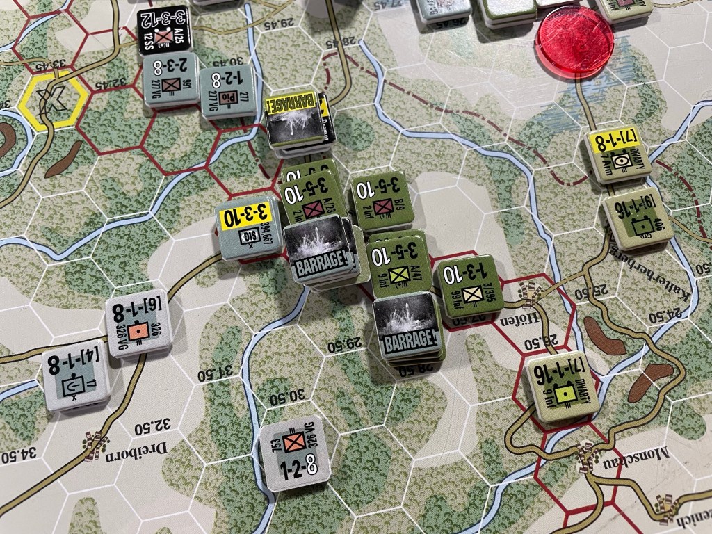 The first difference from other Standard Combat Series games that I want to dive into is the difference in Barrage. In other Standard Combat Series games, a Barrage will typically inflict step losses to units targeted or at a minimum place a DG or Disorganized Marker. This is the first of the major changes found here in the 2nd Edition of Ardennes II as the different Barrage Markers used in the process of artillery attacks will effect the units Attack, Defense and Movement values. If one Barrage Marker is placed, it will effectively halve those values and if a 2nd is placed it will compound the effect and quarter those values. This was a nice change as I liked how the artillery felt like it was softening up the enemy before attacks were made.