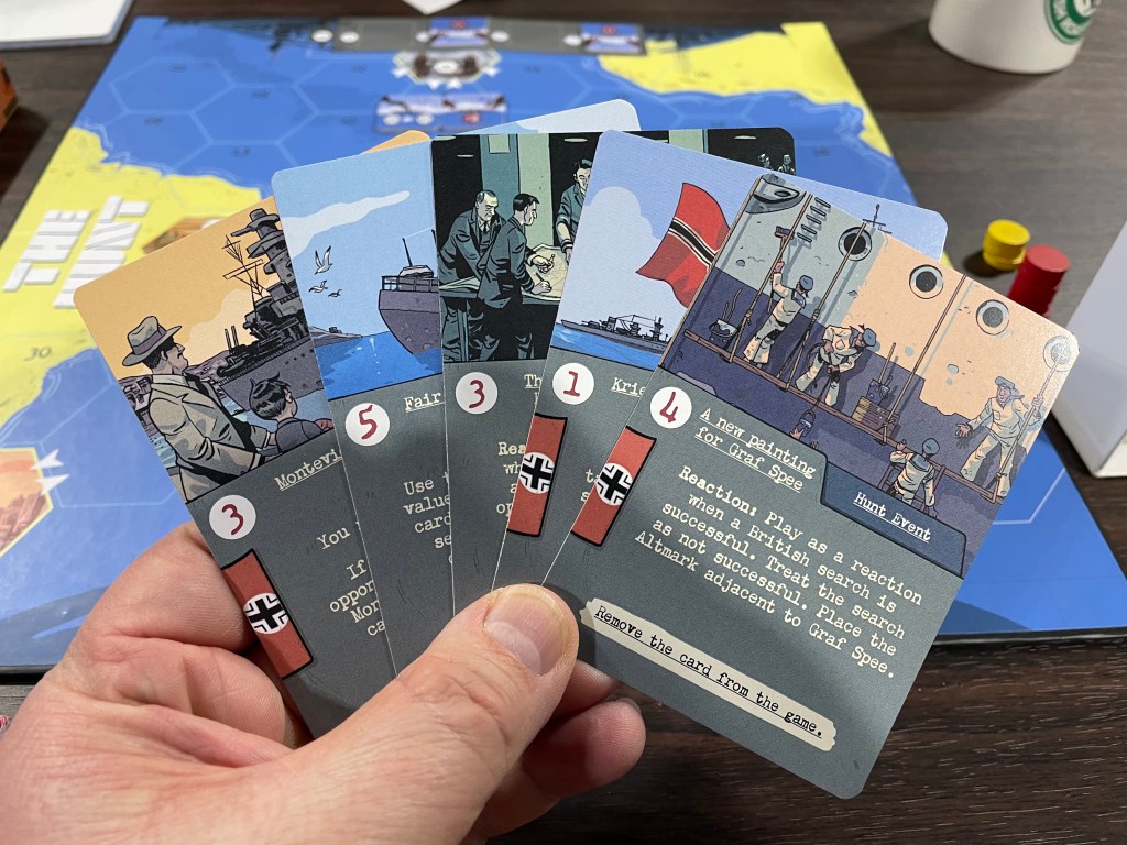 The Altmark counter is placed on the board and acts as a resupply option for the Graf Spee as at the end of the German turn the number of cards they will draw is associated with the proximity of the Altmark counter in relation to the hidden location of the Graf Spee on the board. If the Graf Spee is in the same or adjacent space as the Altmark, the German player has the option of drawing up to 5 cards which is their maximum hand size. If thy are not adjacent to the Altmark, they can only draw cards up to a maximum of 3 cards. And here is one of the best parts of the game in relation to cards. Bluffing. The player may very well be adjacent to the Altmark and could draw up to 5 cards but there are times that you MUST NOT draw the cards you COULD. You have to think about how much the British player knows about your location and how close they are to you. If they find you, this will end in an immediate battle and the winner takes all and combat is not as easy for the German player.