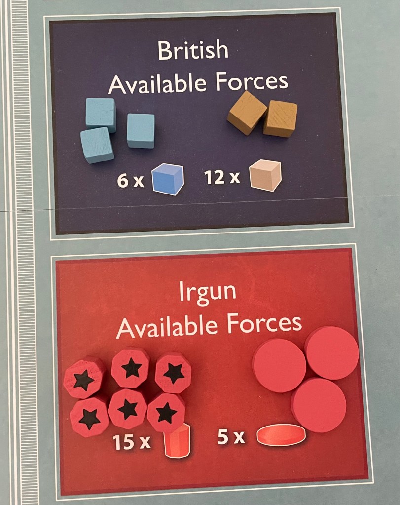 One other aspect that makes the game feel like “Baby COIN” is the relative lack of pieces for either side in the game. As you can see from the British and Irgun Available Forces Boxes, the British have 6 Police Cubes and 12 Troop Cubes for a total of 18 pieces at their disposal while the Irgun have 15 Cells (cylinders) and 5 Arms Caches (discs) for a total of 20 pieces. This means there are never a ton of pieces on the board. Especially with the Irgun and their complex relationship with Haganah, who is the paramilitary armed wing of the Jewish Agency, and the British attempting to arrest and detain insurgents in Prison, they will more than likely have just 11 pieces available during the mid-second Campaign and the third Campaign.