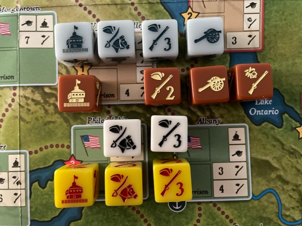 One of the best parts of the game was the custom dice and how combat works. The custom dice actually have the silhouettes of the various units available to each side etched into their surface and each of the dice are different colored to make their affiliation and type clear. The game is strategic in scope and there really are only a few different types of units including Forts, Cavalry, Regulars, Militia/Irregular Troops and Cannon. The game does involve conquest which is determined by die rolls against the strength of various Location’s Defenses found on the game map or also on the Location Cards. The Combat System is really pretty cool and uses a modified version of the dice system found in games like Elder Sign, which is a Euro horror themed game where players have to roll dice to obtain different symbols to defeat Ancient Ones and other challenges.