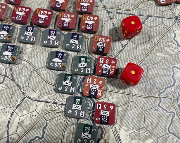 Sometimes good, old fashioned hex and counter wargames are the best! You line up your counters in long continuous lines and attack, pushing the enemy back, having your own forces fall back after an attack, waiting for your opportunity to pounce. Once a line is broken, scrambling to bring up units in reserve to try and plug those holes. Maintaining supply and trying to cut the supply of your opponent. Good stuff! And these kind of games on the East Front are always interesting for various reasons. Earlier this year, we acquired a copy of a new game from VUCA Simulations called Traces of War which is a two-player game that simulates the intense fighting between Axis and Soviet forces just after the battle of Kursk during August 1943 to March 1944. A major Soviet offensive is launched against a German mobile defense.
