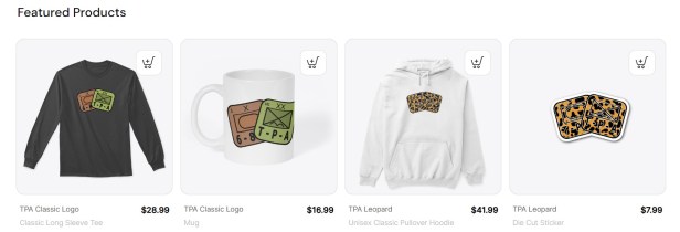 You can find t-shirts, sweat shirts, coffee mugs, fleece blankets and die cut stickers with our very fashionable logo. We even have a few new offerings with a leopard print logo and some other goodies. Take a look!