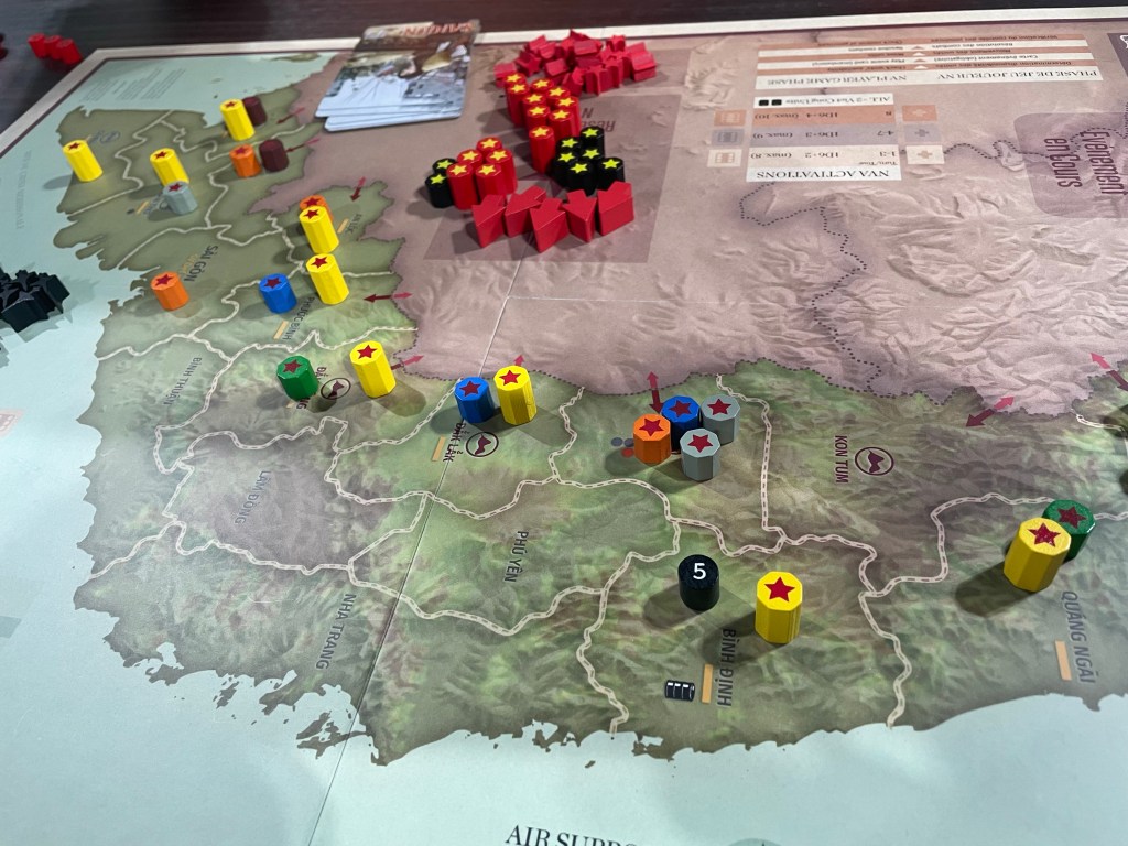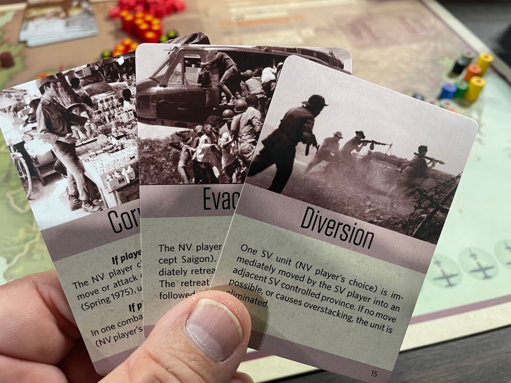 The game uses cards that provide Events for the players and are very asymmetric and fairly mean spirited as most of them do bad things to your opponent. The game has a total of 20 Event Cards with 6 being to the advantage of the South Vietnamese player and 12 to the advantage of the North Vietnamese player along with 2 neutral cards. The active player must play one of the cards in their hand at the start of each of their turns, and the event associated with it is in effect during that phase. Some have very good effects and others not so good. Each card is discarded after the event has been fulfilled, or at the end of the active player’s phase depending on the card. These cards are not like typical CDG’s as they cards have no Operations Points but only events.