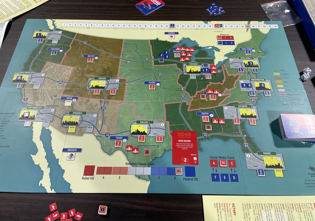 2040: An American Insurgency is a card driven game that attempts to simulate a near future US civil war in the 21st century. In this 2-playe game that plays in less than 3 hours, the blue team is the Federals representing agents of the government in Washington. The red team are the Rebels including militia groups trying to seize control of states, highways, and cities. The conflict spreads across the entire continental US, from Miami to Seattle and from Los Angeles to New York.
