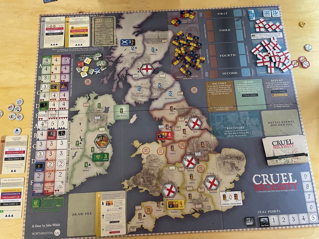 There are civil wars going on not just in England, but in Scotland and Ireland too; and each will have varying impact on the play of the game at different times. The title comes from the purported response to the beheading of King Charles by his implacable foe, Oliver Cromwell, who remarked that this act of regicide was a “Cruel Necessity.”