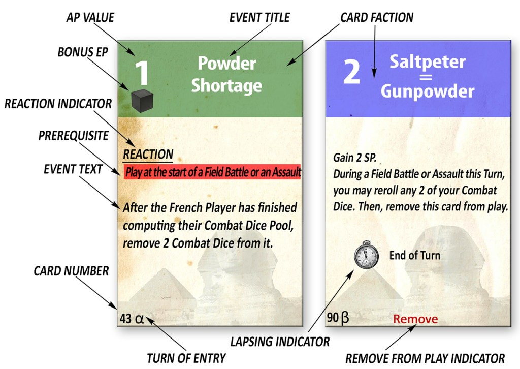 Pascal: Players familiar with the Here I Stand Home Cards will feel at home here! Each player has a Home Card which is not part of their hand, and which is turned on its Available side at the beginning of each Turn. They are powerful cards! During their Impulse (or during a combat for the French player if played as a Reaction Event), if their Home Card is on its Available side, a player can play it for its AP or its Event. Their Home Card is then flipped over to its Unavailable side to indicate that it is no longer playable for that turn. While the Allies Home Card provides new units or helps them to obtain Naval Supremacy, the French Home Card has two options which reflect their superiority in battle or the work done by their scientists and administration to conquer hearts and minds (see below). All art is prototype version and absolutely not final.