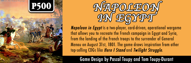If you are interested in Napoleon in Egypt, you can pre-order a copy for $62.00 from the P500 game page on the GMT Games website at the following link: https://www.gmtgames.com/p-1004-napoleon-in-egypt.aspx