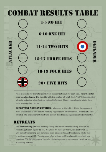 Kevin: The CRT is super-simple. Two columns – one for the attacker and one for the defender. 6 Rows (from 0 hits to 5 hits), based on the combined total of each side’s combat factors and die roll. You put a national roundel on the row that applies. That’s it. The rules are printed right on the CRT explaining how to apply “hits” to one or both sides, based on the “hit” differential. There are a couple of rules for mandatory losses when both sides score 4+ hits and a retreat protocol for the last defender in a hex, and all that is printed right on the CRT – again, no rulebook needed.