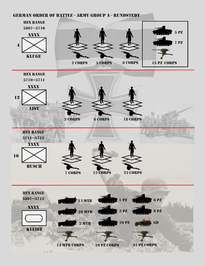 Kevin: The scenario for the game is always the same – May 10th – 29th, the 1940 Campaign in the West. The Wehrmacht vs. Holland, Belgium, England and France. Now, one could play a separate “Battle for Holland” scenario fairly easily, I suppose, where the German player controls only the 18th Army and the Luftwaffe Fallschirmjager and airlanding units (and, say, two of their Fliegerkorps) against the four Dutch Corps with their arty units. That might be a good way to practice as a solo experience for the German – since the Allied player in such a scenario would not really get to do much. Might just include that in the German playbook – still room and time for edits!