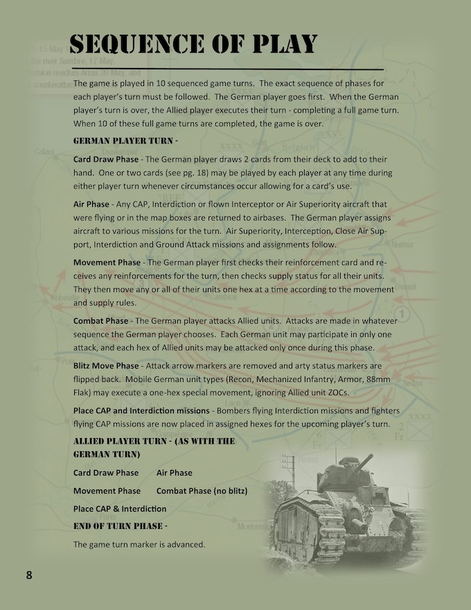 Kevin: The German player’s progress relative to history determines victory. To win, the Germans must first defeat Holland and Belgium, or they automatically lose (a decisive Allied win). Accepting that the Germans defeat both Holland and Belgium, the scale of victory then depends on how many French and BEF units are destroyed, how many French towns and cities are in German hands, and what the overall loss ratio (German units to Allied units) has become by the end of the last turn (there are only 10 turns).
