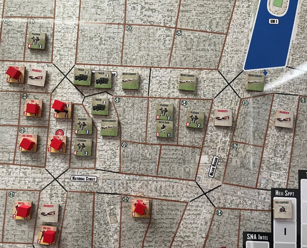 The game is frenetic and the US Special Forces are beset on all sides by local Militia, Somali National Alliance (SNA) Snipers, RPG Teams and Technicals (pickup trucks with .50 caliber machine guns mounted in the back) who spawn via a random die roll and flood units into areas that come after the US troops. These enemy units are not elite units, unlike the US Delta Teams, Rangers and Platoons they are attacking, but as their numbers are more numerous and the fact that they just keep coming at the US forces, they will inflict lots of casualties. Players have to protect these casualties as if they lose too many men that are killed they will lose the scenario. This is where the Relief Convoys come into play as they are dispatched each turn from the UN Base and and meander their way toward the closest US units. Each round, one such Relief Convoy counter is placed out on the street by the player leading from the UN Base toward the action. Once they have made a contiguous line of safe Relief Convoy counters, which means they are not under direct attack, US units as well as casualties can be transported quickly back to the UN Base and escape the determined SNA units. This is definitely a fast and interesting game and the spawning SNA units just keep coming! If you have seen the movie Black Hawk Down, you will have an idea what this is like and how the “Skinnies” just keep coming.