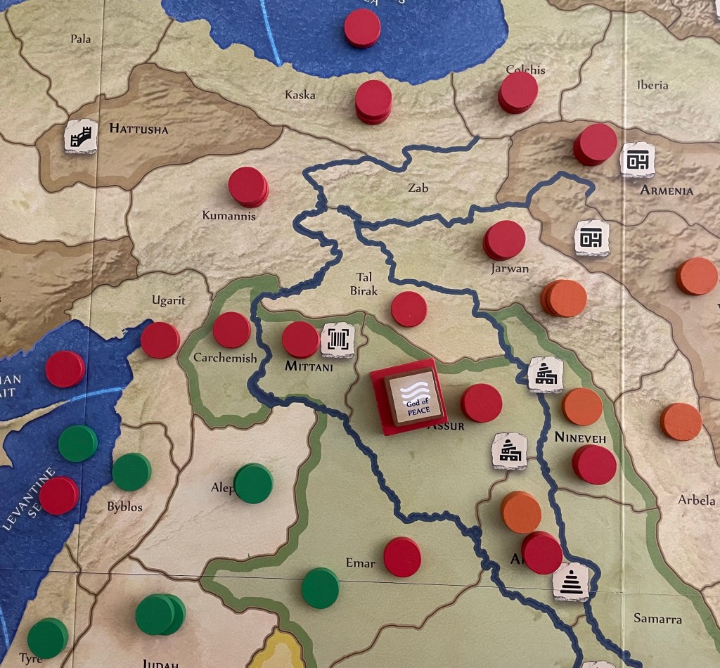 In the picture above, the Assyrians will receive 12 disks during the Acquisition Step. Can you see why? They have disks in 3 Sea Areas which will create just 1 disk (1 for every 2 Sea Areas occupied), 0 disks for Mountains Areas as they only have 1 Settlement in 1 Mountains Area, 4 disks for having Settlements located in Plains Areas, 5 discs for Controlling 4 Fertile Areas and having a Settlement in 1 other and are adjacent to 2 opposing civilizations which will garner 2 disks. 1 + 0 + 4 + 5 + 2 = 12 disks.