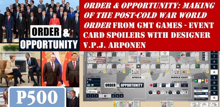 We have worked with V.P.J. Arponen over the past several years with his fantastic entry into the COIN Series covering the Finnish Civil War called All Bridges Burning: Red Revolt and White Guard in Finland, 1917-18. We posted an interview for that game as well as about a dozen Event Card spoilers from that same title. More recently, his new design called Order & Opportunity: Making of the Post-Cold War World Order was announced by GMT Games and we are again honored to work with him to bring an inside look at the game to the faithful readers of the blog with a series of Event Card Spoilers. Please keep in mind that the artwork and layout of these cards is not yet finalized and is only for playtest purposes at this point. Also, as the game is still in development, card details may still change prior to publication.