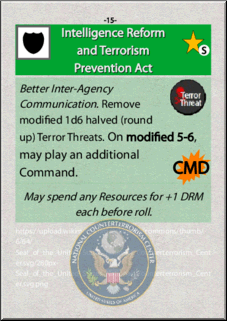 Terror threats resolve in one of two ways: either the player must face a Terror Threat Check occurring at random during play and possibly resulting in the loss of a victory point, or they use a card like the Intelligence Reform Act to lower the threat level before it is too late.