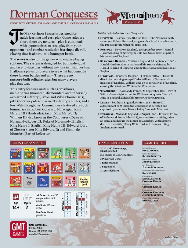 In 2020, we finally discovered the Men of IronSeries by playing the Men of Iron Tri-Pack, which is a large boxed game that includes the first three games in the Men of Iron Series from GMT Games including which includes Men of Iron:Infidel and Blood & Roses, plus the Battle of Agincourt from C3i Magazine #22. This box was huge and heavy and is probably one of the greatest values in wargaming as there are three games and the box is packed full to the brim with counters, maps and player aids. We really enjoyed our foray into the series and would love to continue playing the rest of the other scenarios. But now there is even more of this series coming with Norman Conquests which deals with the conflicts of the Normans and their successors from 1053-1265.