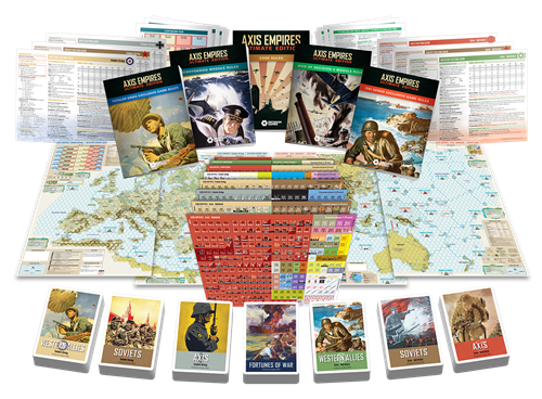 This is a monster wargame! There is no doubting that with 4 full maps, 2,380 counters, 20 map variant overlay sheets, 500 Playing Cards making up 7 decks and 30 Player Aid Sheets. Axis Empires Ultimate Edition is a mishmash of some of their most population strategic level wargames covering the different theaters of WWII but also has some new content and expansions.