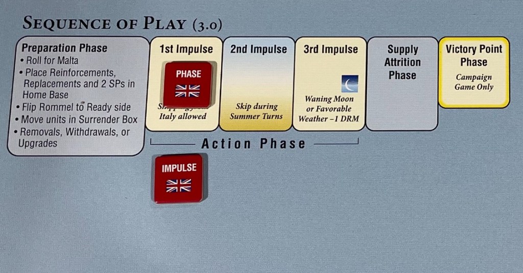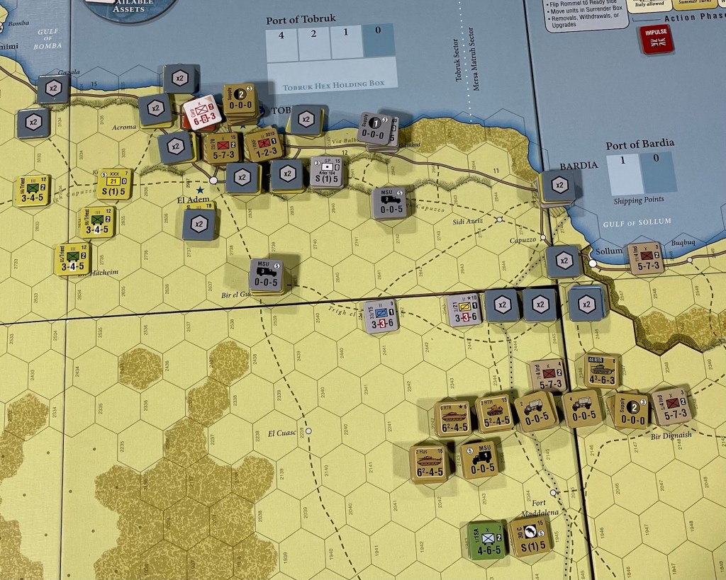 The turn structure is also very different from other games in the series. The turns are not traditional turns where each player gets to activate and move all their units and then fight and the turn ends but is made up of 3 separate impulses called the Action Phase. All 3 of these impulses have movement, combat and there are things like the Events that happen with a roll on the Events Table. You may also notice that the 2nd Impulse is skipped during Summer Turns because of the hot weather and the taxing effect it had on operations. Supply Attrition happens after the end of the 3rd Impulse which is important to take note of because you will have a full 3 activations and opportunities to put enemy units out of supply or to break through enemy lines to restore supply. The importance of supply cannot be overstated, especially for the beleaguered Allied troops holed up in Tobruk. The Axis has got to work hard to encircle them, destroying their ports and shipping to limit the number of units that can be supplied per turn, and also prevent the advancing Allied forces from the south to breaking through and relieving the siege.