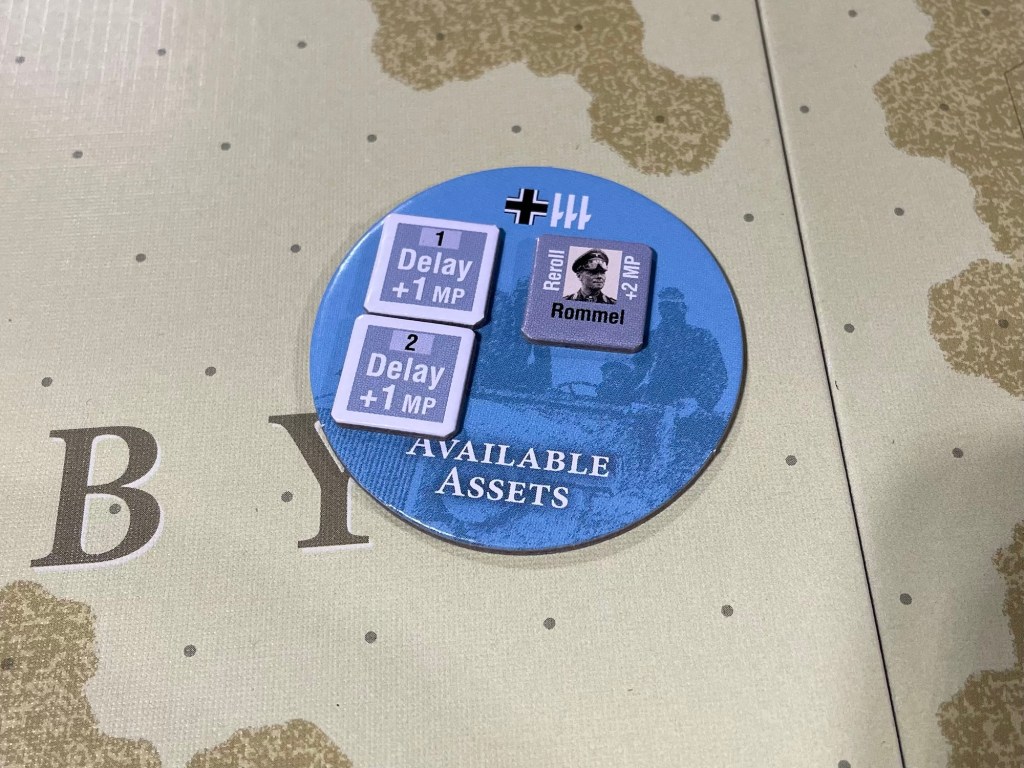 Resource Points are also important and allow the players to purchase various available assets. These assets include things like air support units, air transport, bombing raids that are important for damaging ports to reduce their supply points, forts and then finally the very important Commando Supremo chit which when used will allow German and Italian units to coordinate and attack together, which is otherwise prohibited. They did provide a nice little Available Assets cardboard circle that you can pickup and move around the battlefield reminding you of the assets you have at that time so you don’t forget them. This was a nice touch that aided in game play.