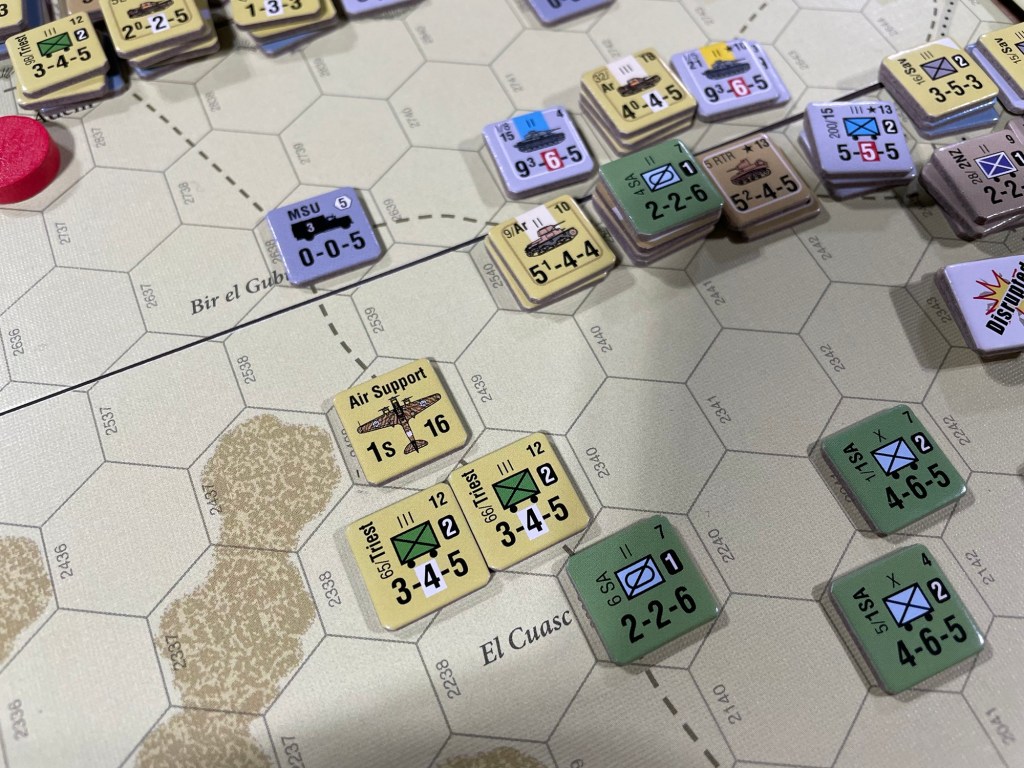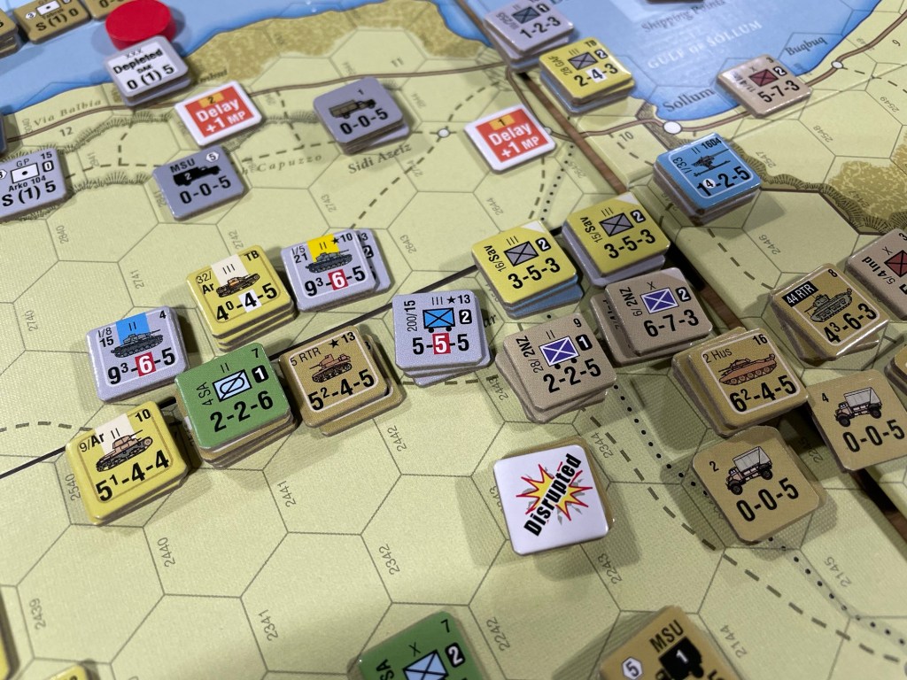 But, with North Africa ’41, there are no traditional ZOC Bonds. You might be saying “Well, Grant has finally gone totally daft!” But, the fact is that there are no ZOC Bonds. No ZOC Bond and it works out well. I think that part of this change for this volume was the terrain of the North African desert and the large dust storms that would be created from large formations or men and vehicles passing through the arid landscape. This means that tank units, recon units and even mighty Panzer tanks can subtly move through the terrain of the desert. And there is a lot open ground on the board but there are lots of rocky areas, escarpments and hills that can be used by both sides to defend and prevent breakthroughs and simply hold up or slow down advancing enemy units. This change had me a bit off kilter during the first turn and my brain reflexively had me moving my units one hex apart to create a stalwart defensive line of ZOC Bonds but after realizing there were none, I quickly was able to change and move into a more traditional unbroken line of units with tanks and other heavy hitters just behind to prevent breakthroughs and to counter attack when the moment was right and once I could get supply into position to do so. There are Limited Zones of Control as well as Overlapping Zones of Control in the game but they are different than the traditional ZOB Bonds and I think this change was very much a need here in the North African Theater to replicate the concepts of broken and inhospitable terrain, great distances and issues with equipment maintenance and breakdown due to sand overload.