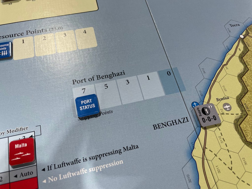 The other important part of this process is the island fortress of Malta. The Axis player can take actions to suppress Malta with Luftwaffe at the cost of Resource Points. This will be an opportunity cost for doing something else on the board and is one of the most important decisions of the game. If you suppress, you will be unable to do bombing raids on Tobruk, which we have already said was very important to breaking the backs of the defending Commonwealth forces, air support, repairing Port Capacity and other things.